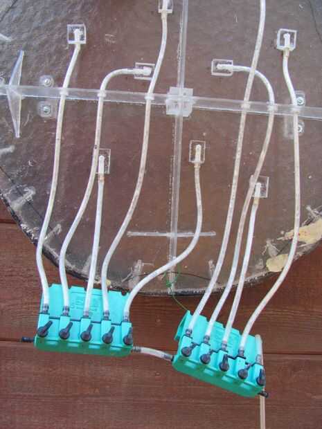 Los agujeros fueron perforados en lugares estratégicos a lo largo de la parte inferior de la bandeja y los bloques alineados y cementado en su lugar. El aire de vinilo tubería conectada a todos los bloques y funcionar detrás a dos colectores de aire de acuario con válvula de salida múltiple. Estos permiten conectar todas las líneas de aire juntos además de proporcionar algunos ajuste fino del aire para asegurar que todas las ubicaciones de burbuja se burbujeo igualmente.