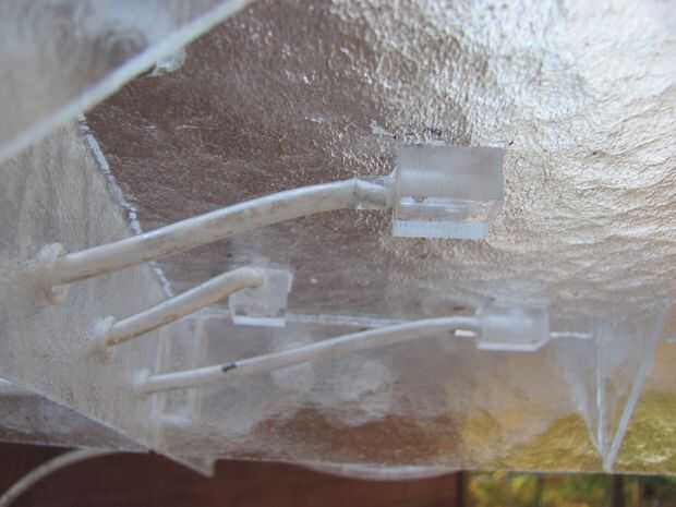 Para proporcionar la burbujeante 'goo' el fondo de la bandeja tenía una multitud de agujeros de aire que proporcione un flujo constante de aire (y las burbujas resultantes) de la bomba de aire acuario situada en la parte inferior de la papelera. Conectores de codo para tubería de aire el vinilo hicieron tomar sólidos bloques de acrílico de media pulgada y taladrar dos a 90 grados para que se reunieron dentro del bloque. Un agujero fue sobre un 1/16 de y pulgadas de diámetro para escapar el aire y el otro lo suficientemente grande para dar cabida a un pequeño tubo de acrílico que encajar sobre el tubo de vinilo. El tubo de acrílico pequeño fue pegado en el bloque asegurándose de mantener la vía de aire abierta.