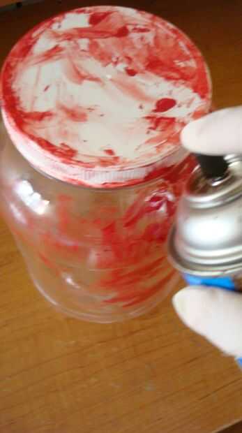 Ahora que tiene un frasco de plástico o un frasco de cualquier tipo, usted quiere tomar su pintura en aerosol rojo. En primer lugar, poner en los guantes de látex. Comience rociando globos de sangre al azar en la jarra. Tome sus manos y borrón de transferencia de la pintura por todas partes. Asegúrese de que no cubra el tarro entero con pintura roja, también quiere asegurarse de que todavía se puede ver a través de él cuando el órgano del cuerpo de goma es en el tacto.