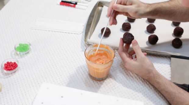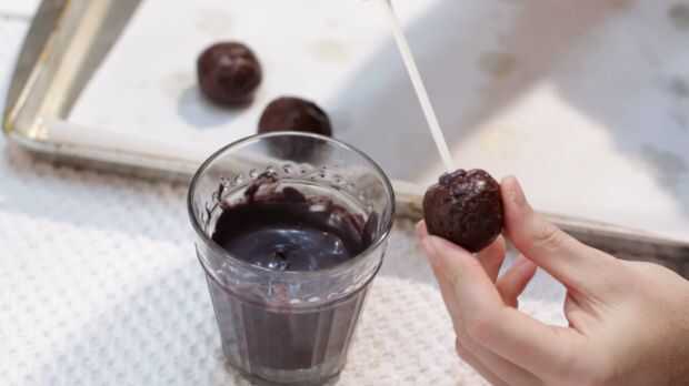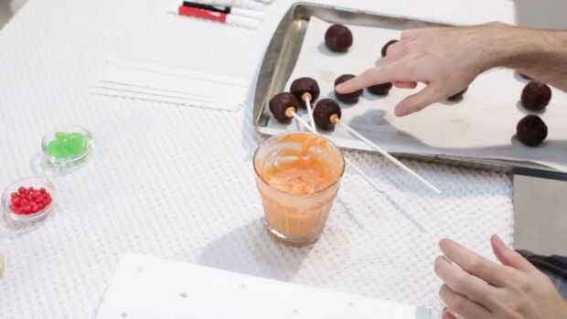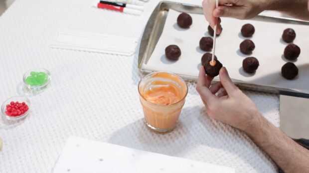 Una vez que las bolas de brownie han tenido tiempo para relajarse, nos derriten algunos candy melts. Acabo de poner en un vaso ancho y derretirles en el microondas en hi por 30 segundos y luego revuelva, luego 25 a 30 segundos, generalmente lo hace. A continuación sumerja la punta de su palillo del lollipop en el derretimiento de caramelo y luego pegarlo en la parte inferior de la bola de brownie. Hacer esto con todos sus palos y los colores de caramelo se derrite. Idealmente, cualquier color se usas para esto, será el color del pop brownie entero. La razón por qué estamos haciendo esto es porque actúa como pegamento para ayudar a sostener la bola de brownie en el palo. Luego ponerlos en la nevera o congelador durante unos 5 minutos dejar un poco de caramelo fundir conjunto.