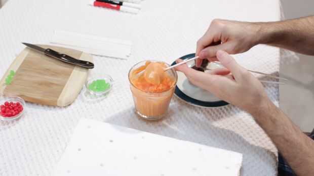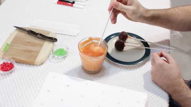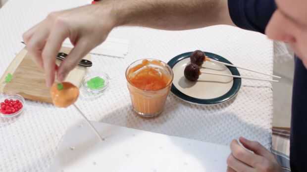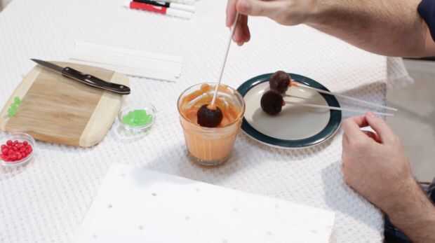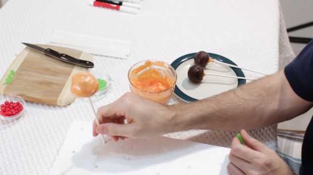 Ahora una vez que se enfría nuestras base brownie pops, nos les sumerja en el derretimiento de caramelo. Asegúrese de que el derretimiento de caramelo no es muy grueso. Puede que necesite poner en el microondas durante 10 segundos. Como nos sumergen, vamos rectos hacia abajo, no revuelva el brownie alrededor en su, caerá! Suavemente puede mover alrededor, pero no mucho, luego lo saca. A continuación golpee ligeramente lo en los dedos, bajar el derretimiento exceso de dulces. Luego lo pegan en su bloque de espuma de poliestireno. Acaba de tomar un pedazo de espuma de poliestireno y poke agujeros, nada extravagante. Luego coloque el pequeño mike verde y punta de ike en la parte superior.