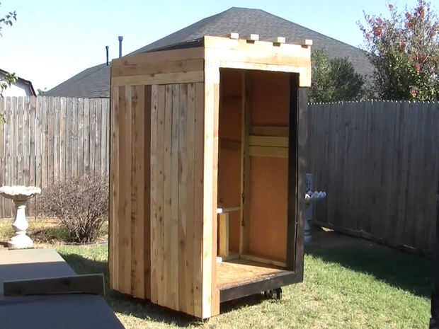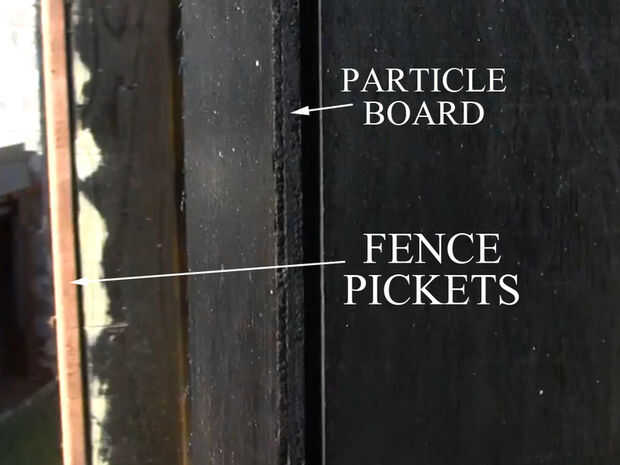 Siguiente paso es cubrir el marco. Usé un muy fino 1/4" de madera pintada de negro en el exterior como la primera piel de la máquina del tiempo para hacer no existir rajas de luz que muestra entre los listones. Esto también ayuda a impermeabilizar un poco mejor. Los listones de madera que utilicé fueron apenas doblada para vallado con dog-ear corte plano. He añadido soportes de 2 x 4 al interior por lo que se podía atornillar el vallado, puesto que no serían muy robustos siendo atornillada a sólo el 1/4" madera gruesa.