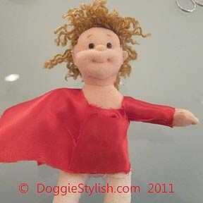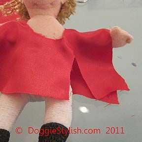 Plegar los lados traseros de tela al frente de la muñeca y pegamento caliente. Recorte a cualquier exceso tejido.