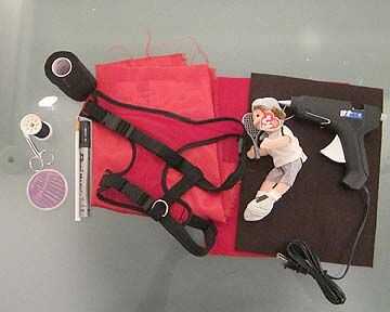 Para hacer este traje, que se necesita; un arnés del perro, un peluche que tiene brazos desechables y las piernas (y si es posible un sombrero), fieltro rojo y marrón, tejido de color rojo brillante, negro y blanco veterinario Wrap (vendaje autoadhesivo animal), un marcador de china, un marcador mágico, tijeras e hilo aguja, una cinta métrica y una pistola de pegamento caliente.