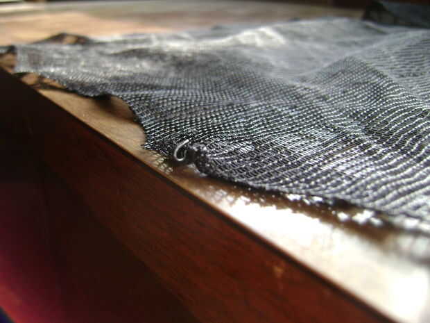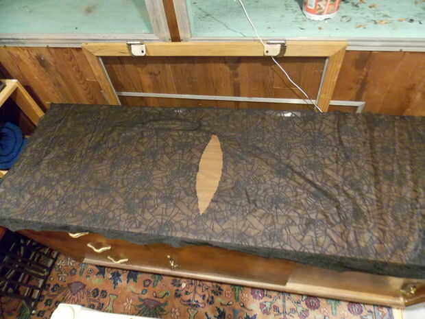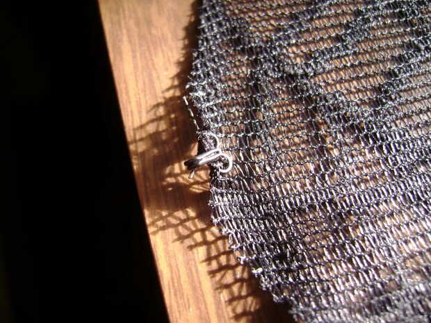 Este es un mantel de araña. Fue cortado a la anchura de mi cuerpo, estilo de poncho, con cierta superposición. Entonces 5 ganchos fueron cosidos a cada borde lateral para sujetar el paño apretado contra mi cuerpo. Los ganchos enganchan justo en los orificios de la tela en el otro lado.