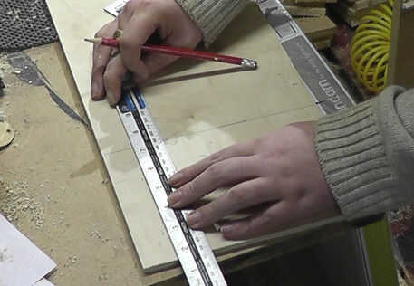 Usted necesita tomar algunas madera contrachapada de 1/4 de pulgada y luego se mide desde el borde de 5 pulgadas y 5/8, después de la superior medida 7 1/4 pulgadas y dibujar una línea a través de esto entonces le dará una forma 5 5/8 x 7 1/4 esta en la Sierra de mesa o la tronzadora y cortar esta forma hacia fuera. Esto con la pieza de madera que se a cortado lugar esto encima de la madera contrachapada de 1/4 de pulgada y dibuja alrededor de ella usando como plantilla, recorte y tendrá dos piezas para el frente y la parte posterior que son del mismo tamaño.