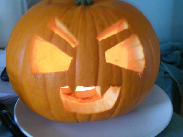 este fue mi primer tallado CALABAZA siempre a mano. No tenía ni idea había herramientas especiales para hacer esto, al parecer para hacerlo más fácil! Tonto me.Me divertí mucho haciendo esto, y los niños que hizo absolutamente me encantó.Por la noche