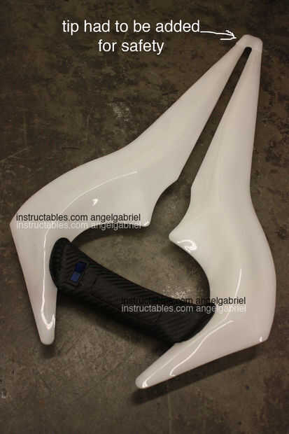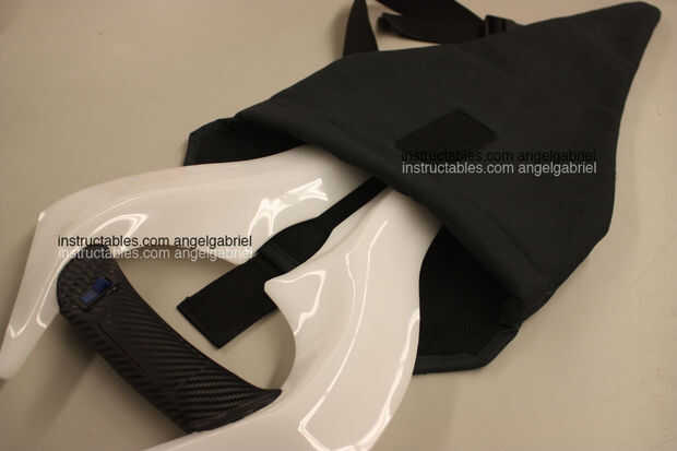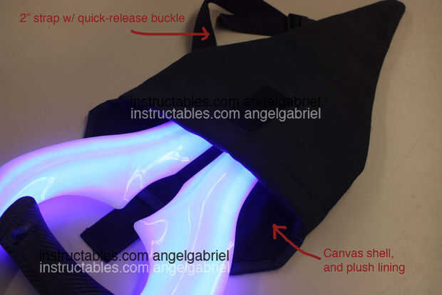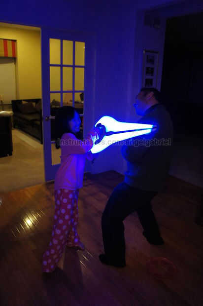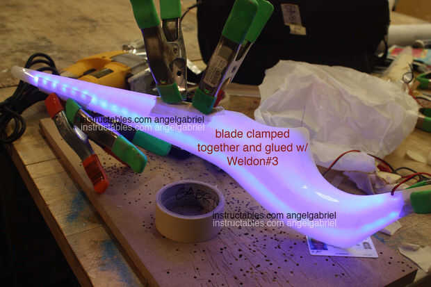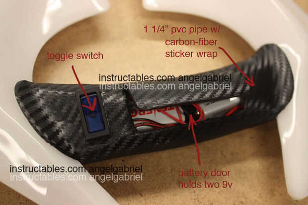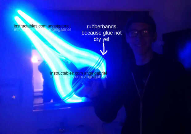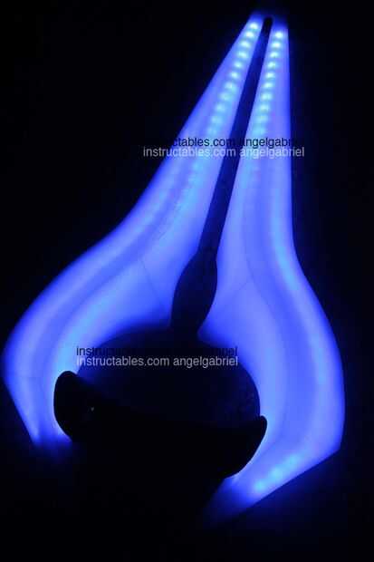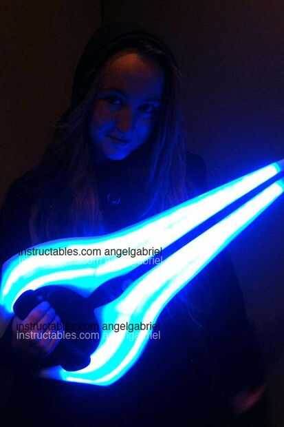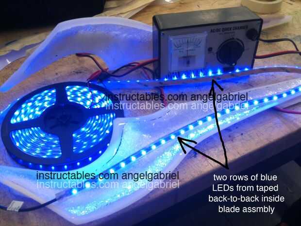 Las luces LED azules de amazon trabaja perfecto. Pude cortar tiras y cuidadosamente de la soldadura de terminales de cables conectado a dos pilas de 9v y un interruptor de palanca. El mango se hizo de un 1 1/4" fina PVC baño tubo de desagüe, formado de forma con una heatgun. Corte una abertura de la puerta de la batería y envuelto el mango entero en una etiqueta engomada de la fibra de carbono. Hice el Estuche suave acolchado con tela negra y forro de felpa para proteger la espada mientras se transporta. El caso tiene cierre de velcro y un 2 "amplia correa de hombro ajustable con hebilla de liberación rápida.