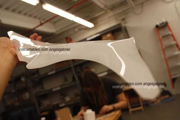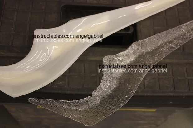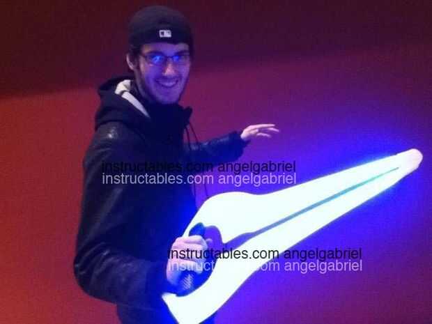 Mi tarea era hacer una lámpara utilizando plásticos y una fuente de luz (LEDs en mi pieza). Este fue mi primer intento en thermaforming hojas de acrílico y con sólo una heatgun para tubos de PVC. Debido a la limitación del tamaño de acrílico material plástico dado a nosotros (hojas 12 "x 24") para el proyecto, la espada es más pequeña que escala como se muestra en el video juego. Las dimensiones finales es aproximadamente 24" longitud total x 12" en su punto más ancho. Sin embargo el tamaño más pequeño es ideal para llevarla alrededor de y para niños pequeños sostener. Es muy sólido y fuertemente puesto juntos, pero no es un juguete para niños o adultos para hacer pivotar en personas, animales o cosas. Podría ser peligroso. Si tuviera que construir otra espada, idealmente haría lo de 28-32" longitud. La foto de yo y amigos con la espada muestra cómo brillante brilla intensamente. TODAS las fotos no son photoshopped excepto las marcas de agua.
