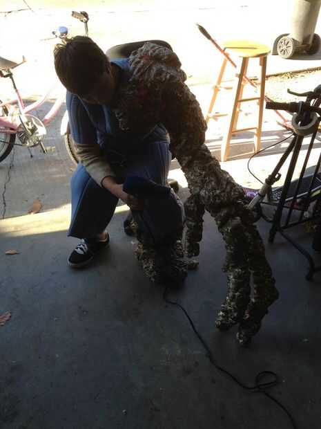 Después de la espuma sobre todo fue curada cepillado marrones y tostados de pintura acrílica para ayudar a acentuar la textura de la espuma y para hacerlo más cercano a la mirada del juego. La foto es de Tonio con secador de pelo para acelerar el proceso de secado de la pintura.