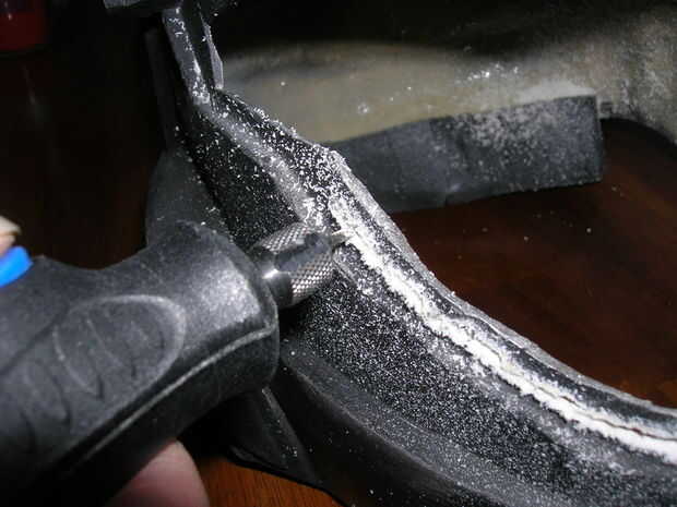 Corte la sección de la visera del casco. El papel y resina aquí es sólo un lugar. Recortar la abertura adecuada forma y tamaño y se preparan para instalar el visor. En la foto, utilicé un poco de corte lado corte de alta velocidad.