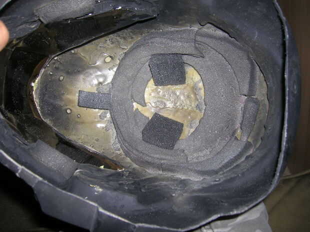 Obtener espuma suave o algún tipo de relleno y pegar dentro del casco para que partes duras del cubo no es presionando sobre le cráneo. No necesita cubrir cada pulgada de su interior con espuma. Un aro o un cuadrado para la parte superior de la cabeza, un par de pequeñas piezas para la parte posterior de la cabeza y un par de pequeñas piezas para el templo es todo lo que nos necesarios para hacer cómodo el casco. Más espuma que pongas el más caliente se pone.