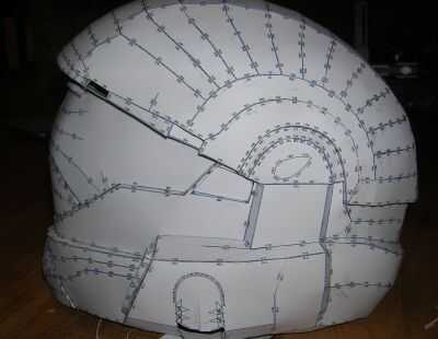 Ahora para la parte tediosa. Escoge un lugar para comenzar en el casco. Personalmente, me gusta a partir de la barbilla y mi forma de trabajo de nuevo y para arriba. Es decir, la barbilla, la mandíbula, la parte posterior del área de la boca, mejillas inferiores, cuello, orejas, la parte posterior de la cabeza, nariz, mejillas superiores, templos, la parte posterior de la cabeza, etc..