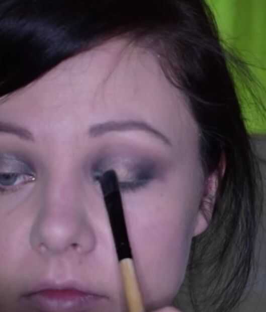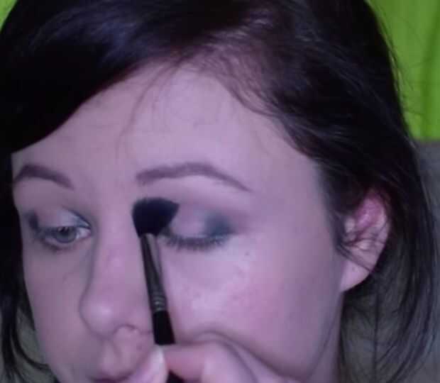 Así que primero apliqué un color verde oscuro a la esquina externa y vértice interno del ojo y luego con un color beige mezcla hacia fuera el verde mezclando esto en el pliegue como color de transición. Luego toma un cepillo más pequeño mullido con un poquito de verde y mezcla los colores de dos esquina juntos para crear la apariencia de halo. Luego con un reluciente color dorado apliqué esto en el centro de la tapa.