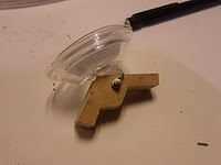 Para hacer un árbol para esto, corte un clavo (manteniendo la parte con la cabeza) y muesca en el extremo de la cabeza no, otra vez con la herramienta Dremel. Coloca la ventosa hacia su concha, inserta el mensaje en el canal de la palanca y deslice el eje a través de los agujeros. Entonces dobló un pedazo de clip de papel alrededor de la escotadura, mantiene todo en su lugar, como se muestra.