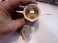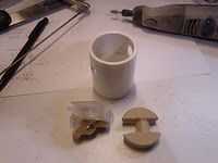 La ventosa aún se mueve libremente cuando la palanca no está en la posición de bloqueo. Esto no es útil para el funcionamiento a distancia; lo que necesitamos es a la fuerza hacia fuera. Esto se logra mediante la adición de algo de la palanca de empuje contra el cuando está en la posición desbloqueada. La forma más sencilla de hacerlo es cortar un trozo de madera y atorníllela al acoplamiento del PVC en justo en la posición. Me puse un poco salvaje con esto y utiliza el labio interior del acoplamiento para mantener todo en su lugar sin tornillos. La pieza redonda de madera que corté, junto con las muescas de los brazos de palanca y un labio alrededor de la circunferencia que descansa sobre el labio del PVC, se muestra en la imagen.
