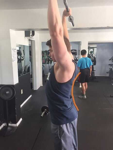 6. Continúe presionando hasta que los brazos están completamente extendidos. La barra debe ser directamente sobre su cabeza.