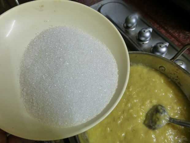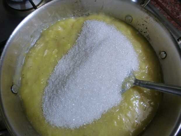 • Cuando la pulpa de plátano un poco brillante, añadir 150 gramos de azúcar que se mantuvo a un lado