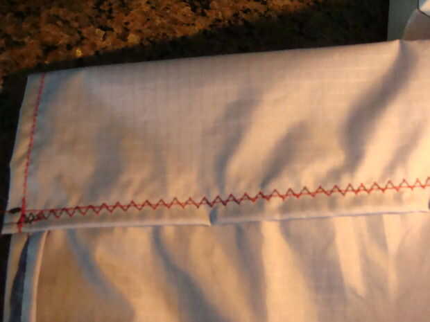 1.) tomar los 2 extremos cortos y doble para hacer espacio para la cuerda (doblado el ripstop hacia abajo de 3 pulgadas y cosida a lo largo de esa línea). Esto deja suficiente espacio para cualquier tipo de cuerda o acorde, grande o pequeño. Servirá como un "tubo" de la cuerda a través del cordón.