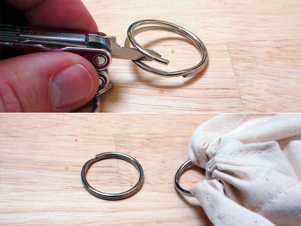 Siempre tengo un tiempo difícil abrir llaveros usé una herramienta para abrir el anillo, el anillo entonces se alimenta a través de los orificios en cada extremo de la hamaca.