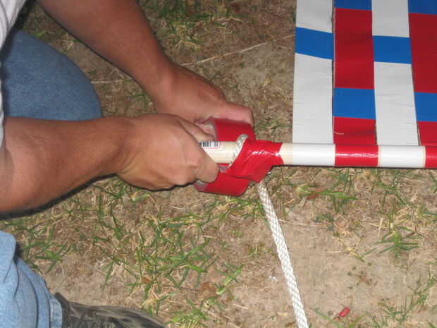 Usted no querría las cuerdas para deslizarse tan segura con... esperar para la cinta de it...duct! La cinta sobre el pasador, el nudo y la espiga en el otro lado del nudo.