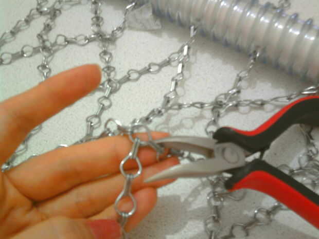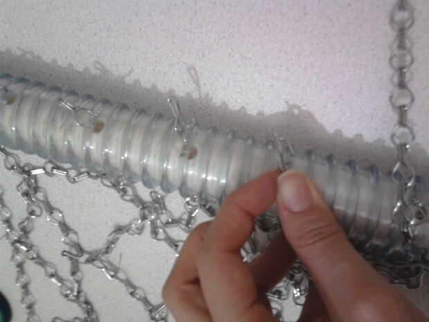 Combinando las cadenas debe ser diagonal, combinar las cadenas utilizan el pliens de punta de aguja. Abra su hilo y cierre después de la combinación. Cuándo terminar la línea conectan metálica otra vez y pasar al otro lado de las tuberías.