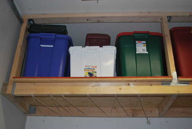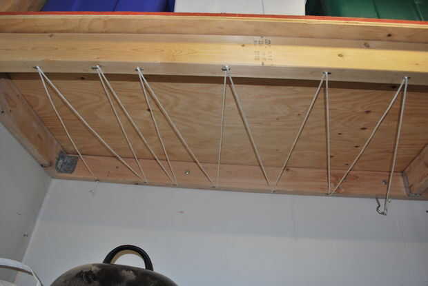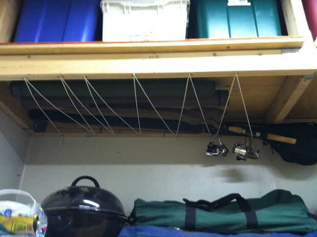 Tengo estantes exsting que construyo para almacenar los contenedores estándar rubermaid llenos de decoraciones de Navidad y de material de camping. En la parte inferior de este estante tomé cierta cuerda de nylon y usa grapas de cable para fijar la cuerda a la parte inferior de mi estante en forma de zig zag. En un extremo hice un nudo estándar y en el otro extremo coloqué un gancho de ojo y había atado un lazo al extremo de la cuerda para que pueda quitar las barras con facilidad.