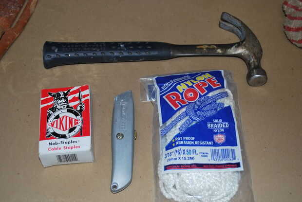 Segundo son las herramientas necesarias (martillo, cuerda, cable grapas y cuchillo de stanley, gancho ojo ya instalado)