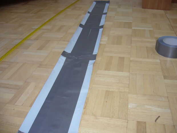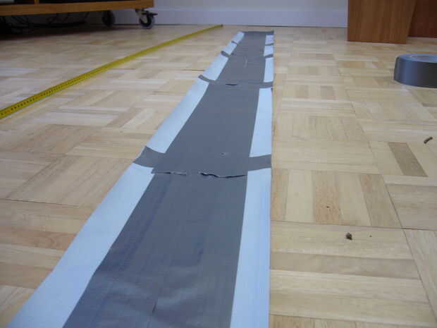 Primero corte 3, 2 lenths metros de conducto de cinta y ponerlos uno junto al otro (lado pegajoso hacia arriba). Luego poner tiras va a través de formas sobre la cinta de conducto, como se muestra en la figura 5.