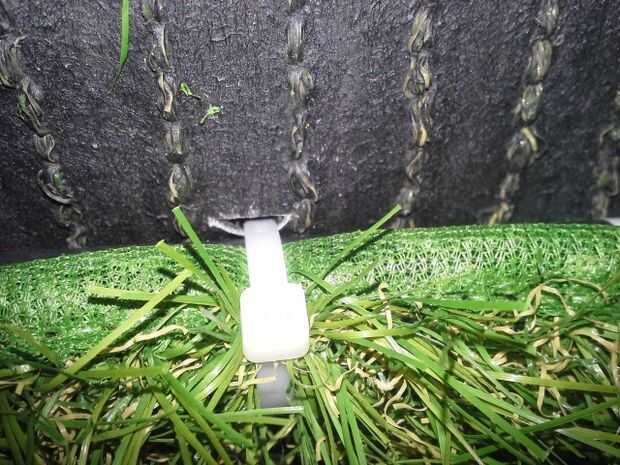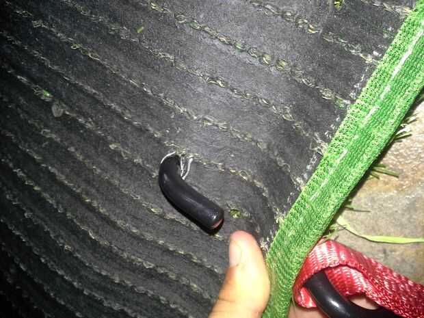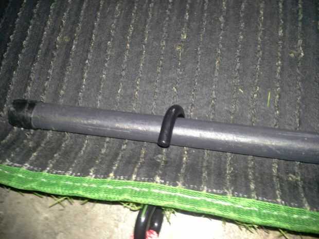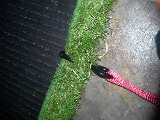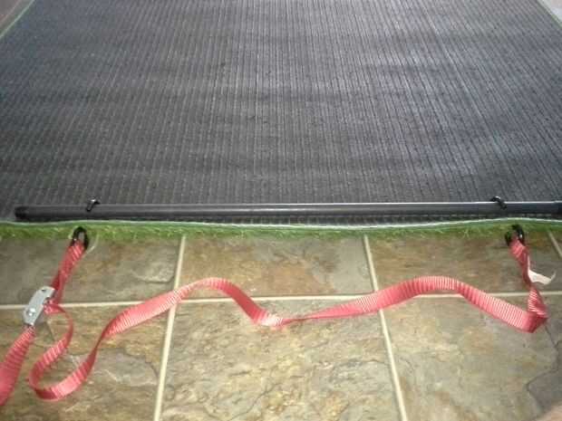 Corté algunas aberturas donde pensé que debo llevar los ganchos a través de. Me Deslice los ganchos en las aberturas pequeñas y colocar el tubo en el gancho. Entonces yo escondido al final de la alfombra entre el gancho y el tubo para mantenerlo en su lugar. Una vez en su lugar utilice unas abrazaderas de plástico para fijar la alfombra alrededor de la tubería. Los lazos del cierre relámpago no añadir demasiada estructura, sólo mantienen la alfombra en su lugar alrededor del tubo. La idea aquí es que la tie downs ir alrededor de la tubería, esto distribuye el peso a lo largo de la longitud de la alfombra.