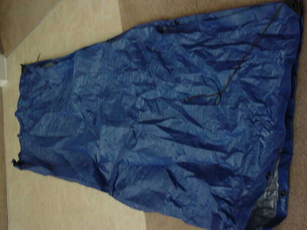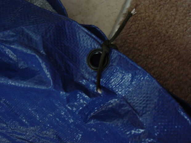 Preparación de la lona todo lo que necesitas hacer es doblar la lona por la mitad y atar los extremos con un nudo cuadrado. (use las piezas de cuatro pulgadas para unir los 2 lados).  Luego ate un enganche de media dos a dos de las esquinas. (Usando los pedazos de 3 pies).
