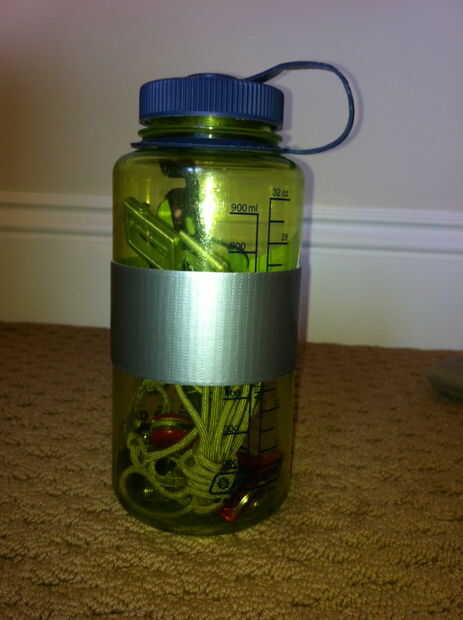 Primero necesitas tomar la cinta y enróllelo alrededor del frasco 6 o 7 veces. La cinta del conducto puede salir y volver a usar. entonces necesitará poner la hamaca en el frasco. Para hacer esto usted dobla estilo perrito caliente luego ruede para arriba realmente bien. Al hacerlo asegúrese de que vincular el cuatro bowlines en las esquinas. Si usted no se enredan. Luego colocar todos los suministros de supervivencia ahí. Incluyen las cadenas dos de 5 pies. Luego recorta los cuatro mosquetones a la nalegene.
