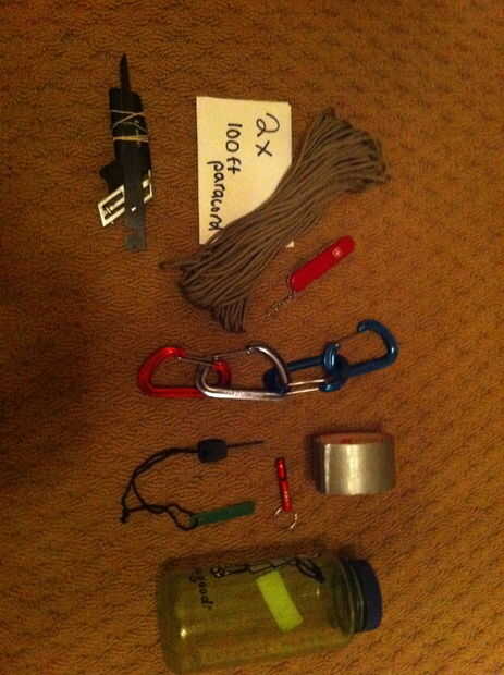 Para hacer la hamaca necesita: 200 pies de paracord 550 (no usará todo) Regla Encendedor Tijeras o cuchillo Cinta de medición Para hacer el kit de supervivencia que se necesita: Navaja de bolsillo Cinta para ductos Silbato Nalgene Acero del fuego