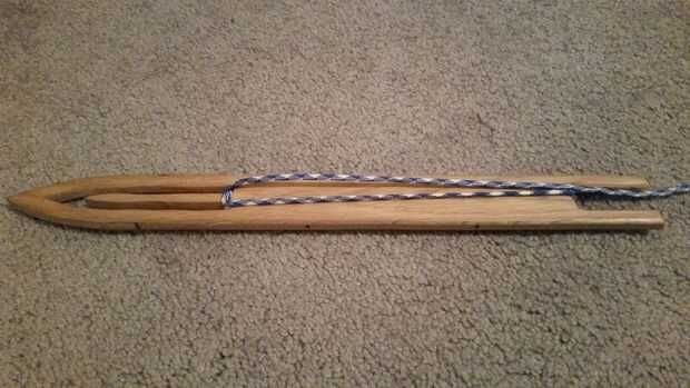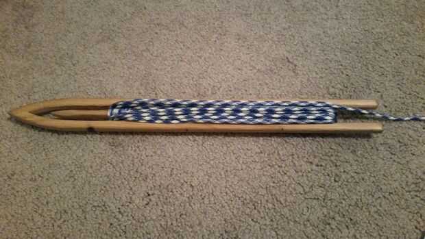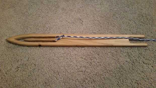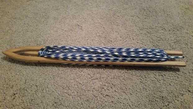 Para cargar la aguja malla, tomar cualquier longitud de paracord desea. Me pareció que una longitud de 48 pies de paracord para completar 4 pasos de los filamentos de primer plano (mitad de una sección de color mostrada - ver paso 24)