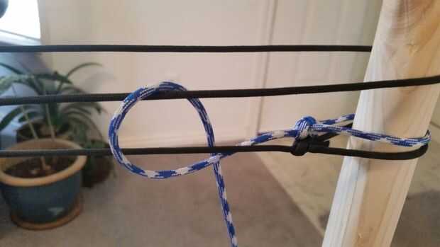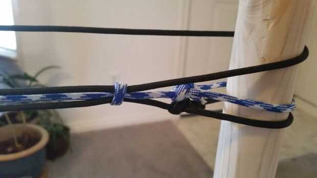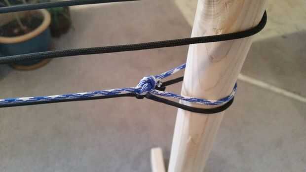 La frontera consta de tres pasos de filamentos de primer plano. Para crear la primera pasada, atar un as de guía entre la parte inferior dos filamentos más de fondo. Usando un nudo, atar los hilos de dos fondo juntos. El filamento de primer plano siempre se mantendrán entre los filamentos de dos antecedentes. Hacer estos nudos uniforme es la parte más importante de la hamaca! Estos nudos crean el espacio que tendrá el resto de la hamaca. Si no están uniformemente espaciados, la hamaca toda será desigual. Para ayudar en la colocación de estos nudos, hice marcas 4 pulgadas aparte en el lado de mi aguja de red con un rotulador. Tomar el tiempo para hacer el primer paso de nudos tan perfecta como sea posible.