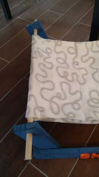 Entonces usted puede atornillar las piezas de madera 25 cm de largo en las cuatro esquinas interiores de la base, primero inserte las varillas en la tela y luego en los agujeros previamente cargado.