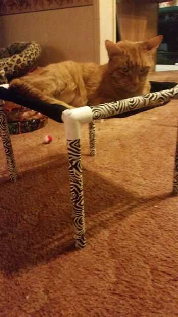 De este pequeño pvc tubo gato hamaca marco acabado son: 10" altura, 10 ½" ancho, 16 ½" largo.Cuando a partir de voluntariado en mi refugio de animales local, yo vi que alguien había hecho hamacas de pvc pipa marco gato. Los marcos de la ham