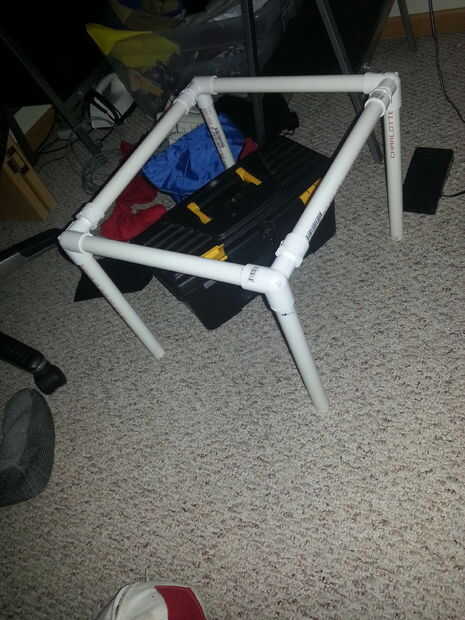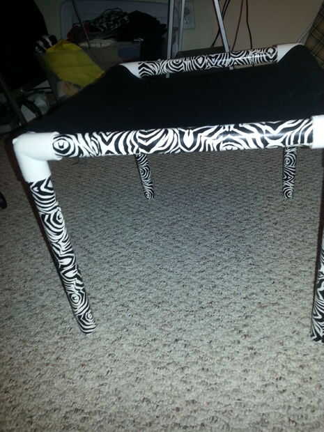 El marco de PVC tubería es bastante fácil de hacer. Theres va a ser para las piernas para el marco. Corté las piernas a 1 pie. (4 piezas). Usé una sierra caladora para cortar el PVC. Entonces usted necesitará cortar cuatro piezas de tubo de PVC. Dos de las piezas será de 10 pulgadas. Las otras dos piezas será de 12 pulgadas. Cuando montaje Asegúrese de que las piezas de 12 pulgadas están enfrente uno del otro y las piezas de 10 pulgadas están enfrente uno del otro. Lijado por el PVC ayuda a limpiar por los extremos de los tubos. Simplemente poner la en los conectores haciendo un rectángulo de cuatro patas. Se verá como una mesa poco antes de añadir el paño.