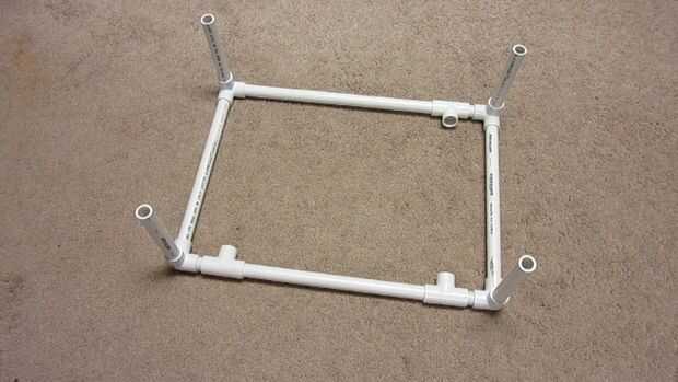 Primero conectar los tubos laterales 12" y las piezas de esquina. El tubo de 14,5" entonces se une a un conector T y una pipa de 1.5" para el frente del marco. La parte trasera utiliza un tubo de 12" con una T y una pipa de 1.5" a cada lado. A continuación, agregue las tuberías de 6" de la pierna.