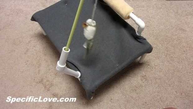 Para un segundo juguete, primero agregué una 6" tubería para un brazo de extensión con un tubo de 45 grados codo y 3" por lo que pude conectar el juguete "ratón una picadura". Cuelga a un lado de la cama. Es simple y sin embargo eficaz. Siempre puede ajustar la longitud de la PVC para agregar cualquier juguete que le gustaría.