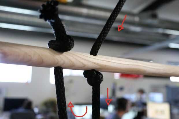 Decida donde quiere su tela para sentarse y luego tomar el extremo restante de las cuerdas y pase a través del orificio de espiga 2 de sus lados respectivos. Un nudo en la cuerda inmediatamente por encima de la espiga, luego dejar unos flojos de pulgadas, cortar la cuerda.