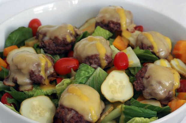 Esta receta surgió como resultado de la creación de la guía de la hamburguesa. Yo estaba bromeando con Randofo acerca de lo que podría contribuir a él y decidí por una ensalada de hamburguesa con queso. No una ensalada con queso y hamburguesas, la ensalada de taco, pero una ensalada con pequeñas islas de recipiente-como cheeeburgers.