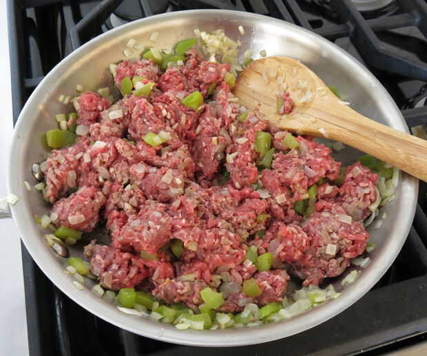 Añadir la carne picada y freír hasta que estén cocidas completamente. Si vas a querer drenar la grasa, puede cocinar vegies y carne de vaca por separado o simplemente escurrir todo una vez cocinada la mezcla. Mía miró bien, así que dejé todo en.