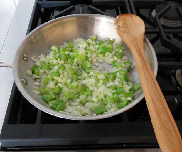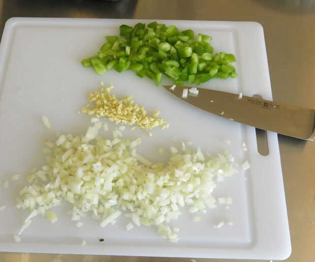 Corte el pimiento, la cebolla y el ajo. Saltear las verduras en aceite.