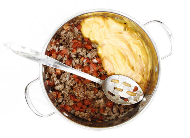 Agregar dos latas de sopa condensada queso y finos con iguales cantidades de leche.  Como alternativa, puede utilizar Velveeta y leche.