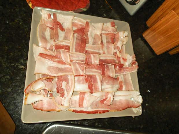 2. Deslice la 8 tira de tocino debajo de la tira 1, sobre 2, bajo 3, sobre el 4 º, etc..