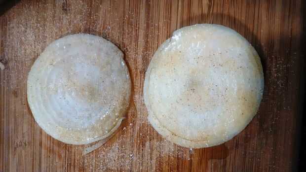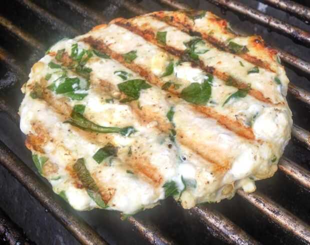 Tomar la cebolla marrón y corte en secciones de una media pulgada de espesor. Cepillo de ambos lados con aceite de oliva y sazonar con ajo en polvo y mar salada. También cepille cada mitad de los rollos con aceite de oliva antes de tostar. Caliente la parrilla y coloque las hamburguesas de pollo por un lado y con cuidado coloque rodajas de cebolla en el otro. Después de unos 5-10 minutos la vuelta cebollas y hamburguesas de pollo. Top las hamburguesas con queso feta, cubierta parrilla y deje que se derrita por unos 5 minutos más. Durante los últimos pocos minutos Coloque bollos en el grill para tostar asegurándose de que no se queme.