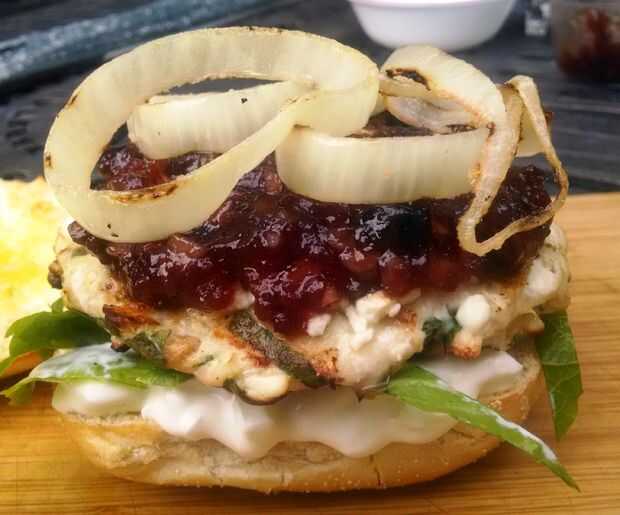 Permite montar. Tome la parte inferior del rodillo la mitad y cubrir con salsa tzatziki y lechuga rallada. A continuación añadir en las hamburguesas de pollo y unte con la compota de arándanos. Rematar con unas rodajas de cebolla a la plancha y listo que acaba de crear una maravilla!
