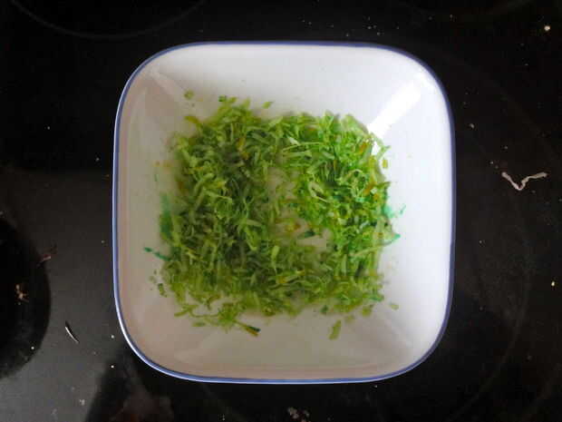 Tomar un coco rallado y poner en un bol, añadir unas gotas de colorante verde y amarillo. Remover y añadir el colorante hasta logra el color deseado de la lechuga.