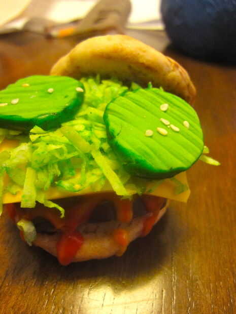 Estirar algunos fondant, colorante verde. Formar en forma de salmuera, luego los bordes del rodillo en un recipiente de colorante de alimentos verde, para que pueda lograr una apariencia más salmuera con bordes más oscuros. Entonces usando un palillo hacer las crestas, añadir unas semillas de sésamo en el centro de semillas y walla! Un pepinillo perfecto.